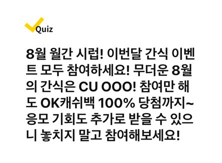 📝 8월 월간 시럽! 이번달 간식 이벤트 모두 참여하세요! 무더운 8월의 간식은 CU OOO! 참여만 해도 OK캐쉬백 100% 당첨까지~ 응모 기회도 추가로 받을 수 있으니 놓치지 말고 참여해보세요!