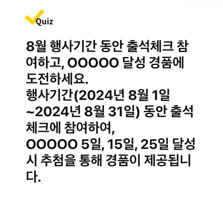 📝 8월 행시기간 동안 출석체크 참여하고, OOOOO 달성 경품에 도전하세요. 행사기간(2024년 8월 1일~2024년 8월 31일) 동안 출석 체크에 참여하여, OOOOO 5일, 15일, 25일 달성 시 추첨을 통해 경품이 제공됩니다.