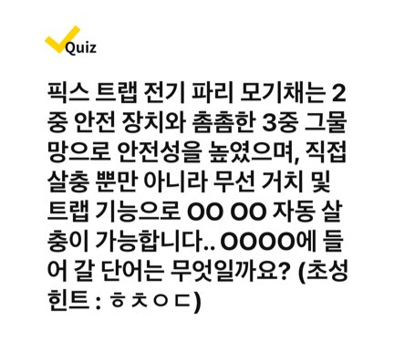 📝 픽스 트랩 전기 파리 모기채는 2중 안전 장치와 촘촘한 3중 그물망으로 안전성을 높였으며, 직접 살충 뿐만 아니라 무선 거치 및 트랩 기능으로 OOOO 자동 살충이 가능합니다.. OOOO에 들어갈 단어는 무엇일까요? ( 초성힌트 : ㅎㅊㅇㄷ)