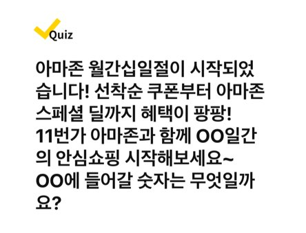 📝 아마존 월간십일절이 시작되었습니다! 선착순 쿠폰부터 아마존 스페셜 딜까지 혜택이 팡팡! 11번가 아마존과 함께 OO일간의 안심쇼핑 시작해보세요~ OO에 들어갈 숫자는 무엇일까요?
