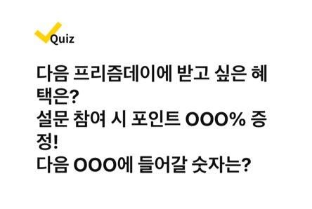 📝 다음 프리즘데이에 받고 싶은 혜택은? 설문 참여 시 포인트 OOO% 증정! 다음 OOO에 들어갈 숫자는?