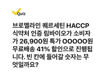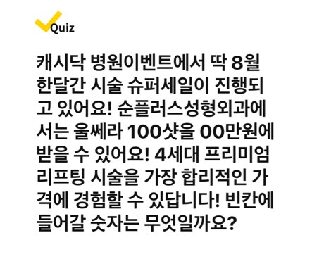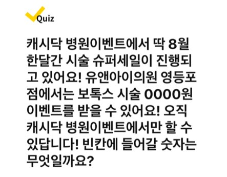 📝 캐시닥 병원이벤트에서 딱 8월 한달간 시술 슈퍼세일이 진행되고 있어요! 유앤아이의원 영등포점에서는 보톡스 시술 OOOO원 이벤트를 받을 수 있어요! 오직 캐시닥 병원이벤트에서만 할 수 있답니다. 빈칸에 들어갈 숫자느 무엇일까요?