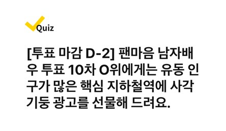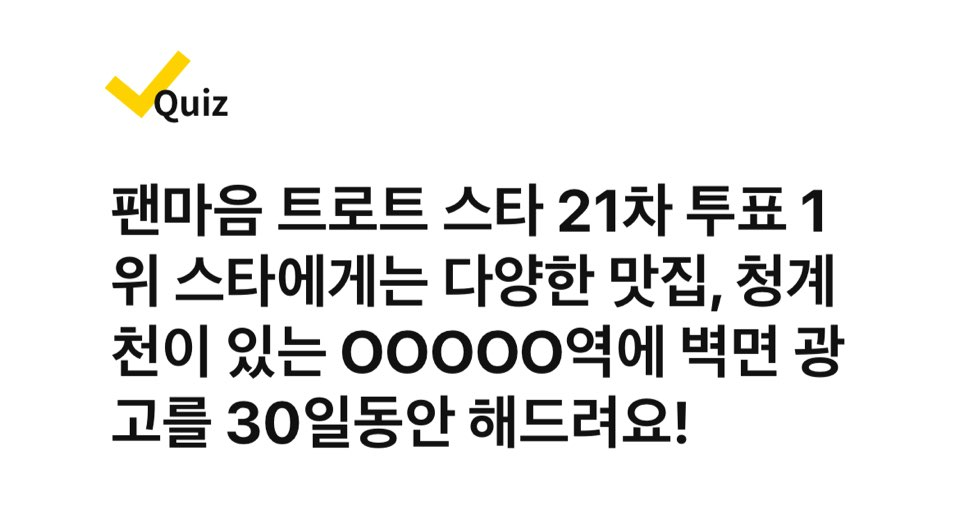 📝 팬마음 트로트 스타 21차 투표 1위 스타에게는 다양한 맛집, 청계천이 있는 OOOOO역에 벽면 광고를 30일동안 해드려요!