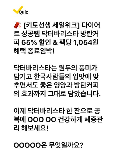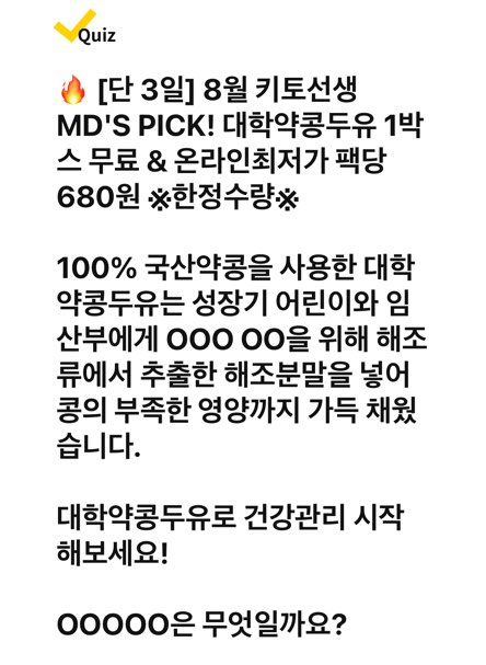 📝 🚨[단 3일] 8월 키토선생 MD'S PICK! 대학약콩두유 1박스 무료 & 온라인최저가 팩당 680원 ※한정수량※ 100% 국산약콩을 사용한 대학약콩두유는 성장기 어린이와 임산부에게 OOOOO을 위해 해조류에서 추출한 해조분말을 넣어 콩의 부족한 영양까지 가득 채웠습니다. 대학약콩두유로 건강관리 시작해보세요! OOOOO은 무엇일까요?