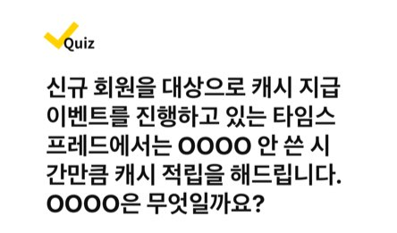 📝 신규 회원을 대상으로 캐시 지급 이벤트를 진행하고 있는 타임스프레드에서는 OOOO 안 쓴 시간만큼 캐시 적립을 해드립니다. OOOO은 무엇일까요?