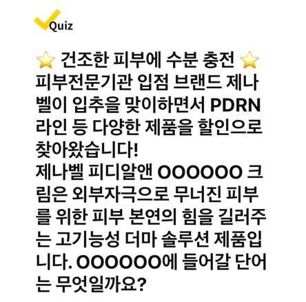 📝 ⭐건조한 피부에 수분 충전⭐ 피부전문기관 입점 브랜드 제나벨이 입추를 맞이하면서 PDRN라인 등 다양한 제품을 할인으로 찾아왔습니다! 제나벨 피디알앤 OOOOOO 크림은 외부자극으로 무너진 피부를 위한 피부 본연의 힘을 길러주는 고기능성 더마 솔루션 제품입니다. OOOOOO에 들어갈 단어는 무엇일까요?