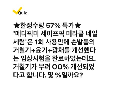 📝 ★한정수량 57% 특가★ '메디픽미 세이프픽 미라클 네일세럼'은 1회 사용만에 손발톱의 거칠기+윤기+광채를 개선했다는 임상시험을 완료하였는데요. 거칠기가 무려 OO%나 개선되었다고 합니다. 몇 %일까요?