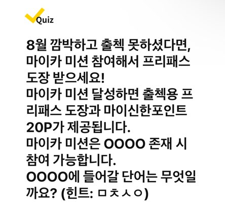 📝 8월 깜빡하고 출첵 못하셨다면, 마이카 미션 참여해서 프리패스 도장 받으세요! 마이카 미션 달성하면 출첵용 프리패스 도장과 마이신한포인트 20P가 제공됩니다. 마이카 미션은 OOOO 존재 시 참여 가능합니다. OOOO에 들어갈 단어는 무엇일까요? (힌트 : ㅁㅊㅅㅇ)