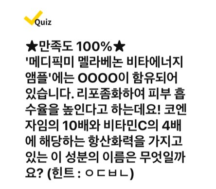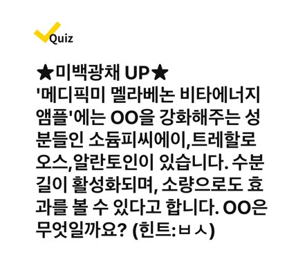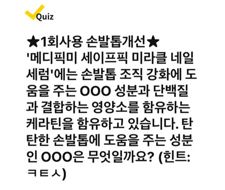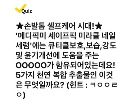 📝 ★손발톱 셀프케어 시대!★ '메디픽미 세이프픽 미라클 네일세럼'에는 큐티클보호, 보습, 강도 및 윤기개선에 도움을 주는 OOOOO가 함유되어 있는데요! 5가지 천연 복합 추출물인 이것은 무엇일까요? (힌트 : ㅋㅇㅇㄹㅇ)