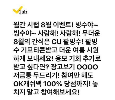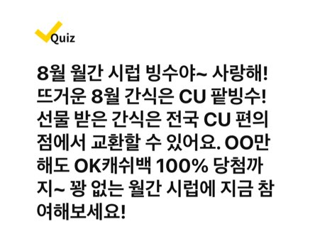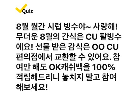 📝 8월 월간 시럽 빙수야~ 사랑해! 무더운 8월의 간식은 CU 팥빙수엥! 선물 받은 간식은 OO CU편의점에서 교환할 수 있어요! 참여만 해도 OK캐쉬백을 100% 적립해드리니 놓치지 말고 참여해보세요!