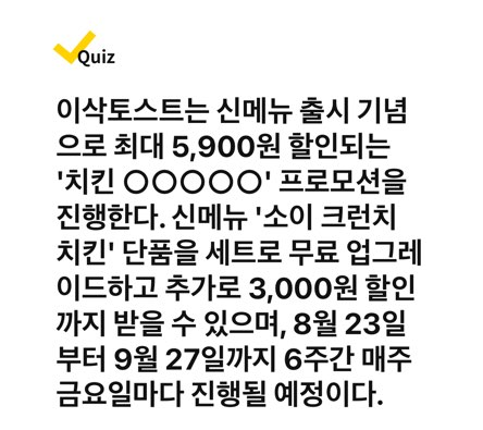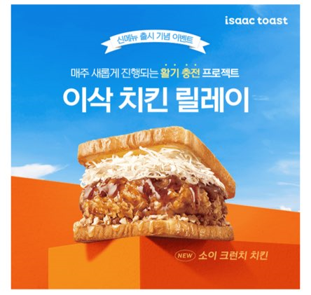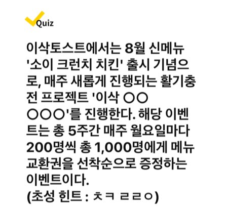 📝 이삭토스트에서는 8월 신메뉴 '소이 크런치 치킨' 출시 기념으로, 매주 새롭게 진행되는 활기충전 프로젝트 '이삭 OOOOO'를 진행한다. 해당 이벤트는 총 5주간 매주 월요일마다 200명씩 총 1,000명에게 메뉴 교환권을 선착순으로 증정하는 이벤트이다. (초성힌트 : ㅊㅋㄹㄹㅇ)