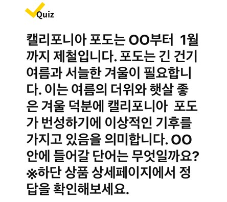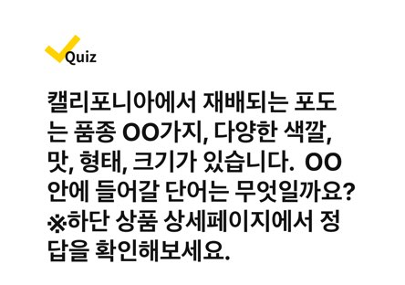 📝 캘리포니아에서 재배되는 포도는 품종 OO가지, 다양한 색깔, 맛, 형태, 크기가 있습니다. OO안에 들어갈 단어는 무엇일까요?