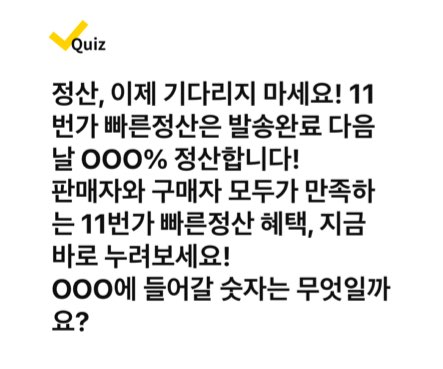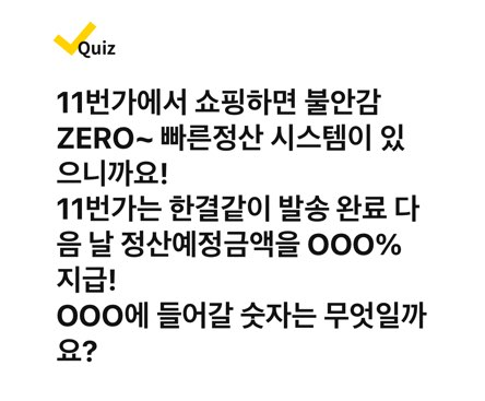 📝 11번가에서 쇼핑하면 불안감 ZERO~ 빠른정산 시스템이 있으니까요! 11번가는 한결같이 발송 완료 다음 날 정산예정금액을 OOO% 지급! OOO에 들어갈 숫자는 무엇일까요?