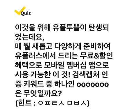 📝 이것을 위해 유플투쁠이 탄생되었는데요, 매 월 새롭고 다양하게 준비하여 유플러스에서 드리는 무료&할인 혜택으로 모바일 멤버십 앱으로 사용 가능한 이 것! 검색캡쳐 인증 키워드 중 하나인 OOOOOOO은 무엇일까요? (힌트 : ㅇㅍㄹㅅㅁㅂㅅ)