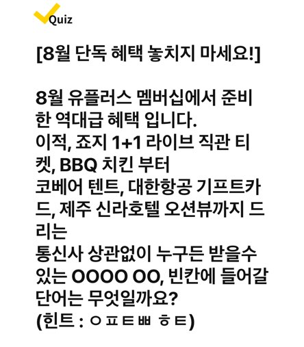 📝 [8월 단독 혜택 놓치지 마세요!] 8월 유플러스 멤버십에서 준비한 역대급 혜택입니다. 이적, 죠지 1+1 라이브 직관 티켓, BBQ 치킨 부터 코베어텐트, 대한항공 기프트카드, 제주 신라호텔 오션뷰까지 드리는 통신사 상관없이 누구든 받을 수 있는 OOOOOO, 빈칸에 들어갈 단어는 무엇일까요? (힌트 : ㅇㅍㅌㅃㅎㅌ)