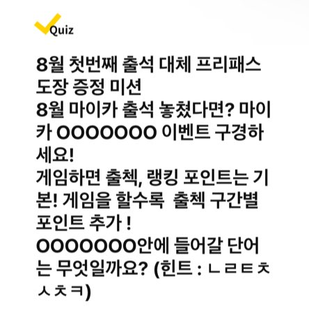 📝 8월 첫번째 출석 대체 프리패스 도장 증정 미션 8월 마이카 출석 놓쳤다면? 마이카 OOOOOOO 이벤트 구경하세요! 게임하면 출첵, 랭킹 포인트는 기본! 게임을 할수록 출첵 구간별 포인트 추가! OOOOOO안에 들어갈 단어는 무엇일까요? (힌트 : ㄴㄹㅌㅊㅅㅊㅋ)