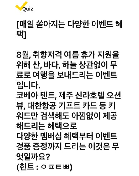 📝 [매일 쏟아지는 다양한 이벤트 혜택] 8월, 취향저격 여름 휴가 지원을 위해 산, 바다, 하늘 상관없이 무료로 여행을 보내드리는 이벤트입니다. 코베아 텐트, 제주 신라호텔 오션뷰, 대한항공 기프트 카드 등 키워드만 검색해도 아낌없이 제공해드리는 혜택으로 다양한 멤버십 혜택부터 이벤트 경품 증정까지 드리는 이것은 무엇일까요? (힌트 : ㅇㅍㅌㅃ)