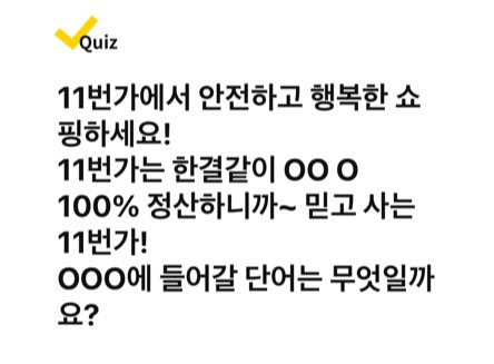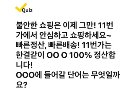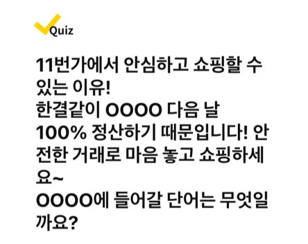 📝 11번가에서 안심하고 쇼핑할 수 있는 이유! 한결같이 OOOO 다음 날 100% 정산하기 때문입니다! 안전한 거래로 마음 놓고 쇼핑하세요~ OOOO에 들어갈 단어는 무엇일까요?