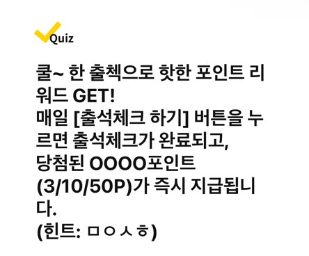 📝 쿨~한 출첵으로 핫한 포인트 리워드 GET! 매일 [출석체크 하기] 버튼을 누르면 출석체크가 완료되고, 당첨된 OOOO포인트(3/10/50P)가 즉시 지급됩니다. (힌트 : ㅁㅇㅅㅎ)