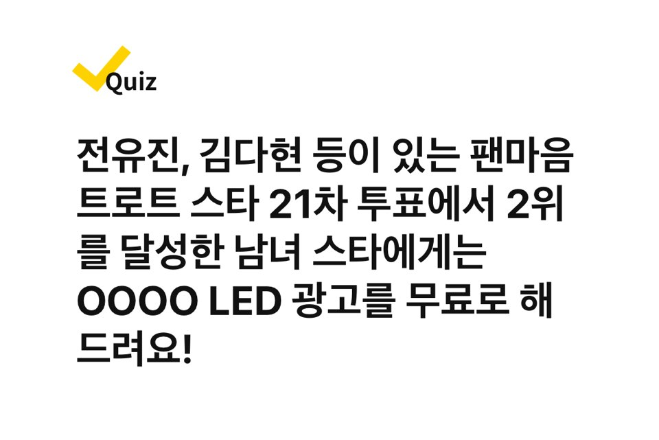 📝 전유진, 김다현 등이 있는 팬마음 트로 스타 21차 투표에서 2위를 달성한 남녀스타에게는 OOOO LED 광고를 무료로 해드려요!