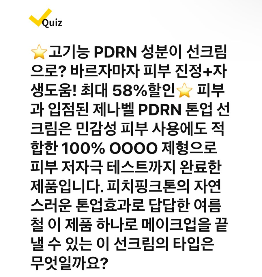 📝 ⭐고기능 PDRN 성분이 선크림으로? 바르자마자 피부 진정 + 자생도움! 최대 58% 할인⭐ 피부과 입점된 제나벨 PDRN 톤업 선크림은 민감성 피부 사용에도 적합한 100% OOOO 제형으로 피부 저자극 테스트까지 완료한 제품입니다. 피치핑크톤의 자연스러운 톤업효과로 답답한 여름철 이 제품 하나로 메이크업을 끝낼 수 있는 이 선크림의 타입은 무엇일까요?