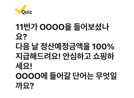 📝 11번가 OOOO을 들어보셨나요? 다음 날 정산예정금액을 100% 지급해드려요! 안심하고 쇼핑하세요! OOOO에 들어갈 단어는 무엇일까요?