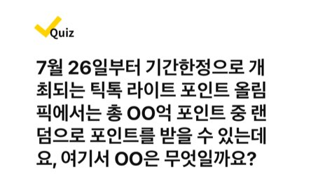 ✅ 7월 26일부터 기간한정으로 개최되는 틱톡 라이트 포인트 올림픽에서는 총 OO억 포인트 중 랜덤으로 포인트를 받을 수 있는데요, 여기서 OO은 무엇일까요?