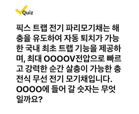 📝 픽스 트랩 전기 파리모기채는 해충을 유도하여 자동 퇴치가 가능한 국내 최초 트랩 기능을 제공하며, 최대 OOOOV 전압으로 빠리고 강력한 순간 살충이 가능한 충전식 무선 전기 모기채입니다. OOOO에 들어갈 숫자는 무엇일까요?