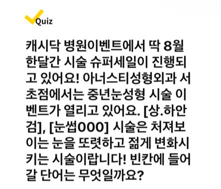 📝 캐시닥 병원이벤트에서 딱 8월 한달간 시술 슈퍼세일이 진행되고 있어요! 아너스티성형외과 서초점에서는 중년눈성형 시술이벤트가 열리고 있어요. [상.하안검], [눈썹OOO] 시술은 처져보이는 눈을 또렷하고 젊게 변화시키는 시술이랍니다. 빈칸에 들어갈 단어는 무엇일까요?