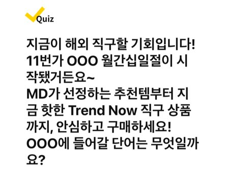 📝 지금이 해외 직구할 기회입니다! 1번가 OOO 월간십일절이 시작됐거든요~ MD가 선정하는 추천템부터 지금 핫한 Trend Now 직구 상품까지, 안심하고 구매하세요! OOO에 들어갈 단어는 무엇일까요?