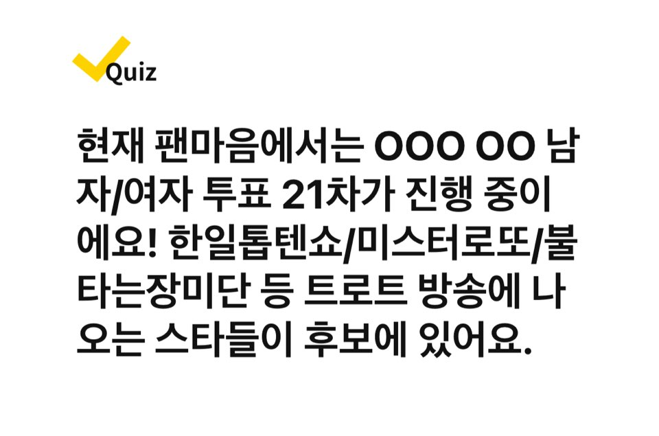 📝 현재 팬마음에서는 OOOOO 남자/여자 투표 21차가 진행중이에요! 한일톱텐쇼/미스터로또/불타는장미단 등 트로트 방송에 나오는 스타들이 후보에 있어요.