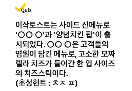 📝 이삭토스트는 사이드 신메뉴로 'OO O'과 '양념치킨 팝'이 출시되었다. OO O은 고객들의 염원이 담긴 메뉴로, 고소한 모짜렐라 치즈가 들어간 한 입 사이즈의 치즈스틱이다. (초성힌트 : ㅊㅈ ㅍ)