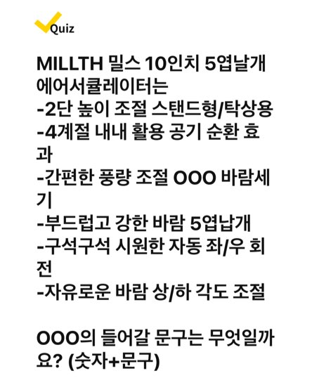 📝 MILLTH 밀스 10인치 5엽날개 에어서큘레이터는 -2단 높이 조절 스탠드형/탁성용 -4계절 내내 활용 공기 순환 효과 - 간편한 풍량 조절 OOO 바람세기 -부드럽고 강한 바랍 5엽날개 -구석구석 시원한 자동 좌/우회전 -자유로운 바람 상/하 각도 조절 OOO에 들어갈 문구는 무엇일까요?(숫자+문구)
