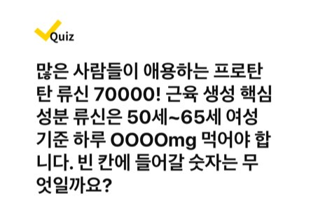 📝 많은 사람들이 애용하는 프로탄탄 류신 70000! 근육 생성 핵심 성분 류신은 50세~65세 여성 기준 하루 OOOOmg 먹어야 합니다. 빈 칸에 들어갈 숫자는 무엇일까요?
