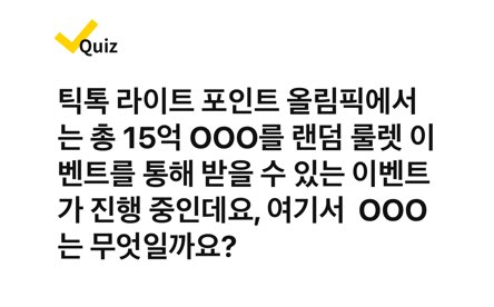 ✅ 틱톡 라이트 포인트 올림픽에서는 총 15억 OOO를 랜덤 룰렛 이벤트를 통해 받을 수 있는 이벤트가 진행 중인데요, 여기서 OOO는 무엇일까요?