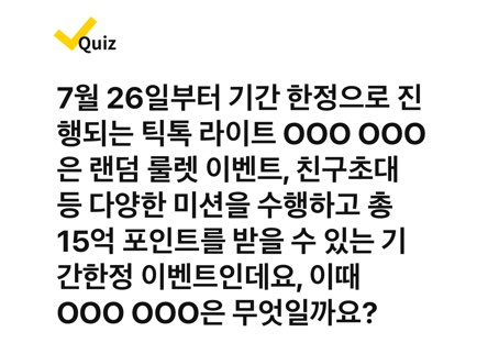 ✅ 7월 26일부터 기간 한정으로 진행되는 틱톡 라이트 OOOOOO은 랜덤 룰레 이벤트, 친구초대 등 다양한 미션을 수행하고 총 15억 포인트를 받을 수 있는 기간한정 이벤트인데요, 이때 OOOOOO은 무엇일까요?