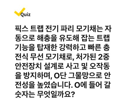📝 픽스 트랩 전기 파리 모기채는 자동으로 해충을 유도해 잡는 트랩 기능을 탑재한 강력하고 빠른 충전식 무선 모기채로, 처가된 2중 안전장치 설계로 사고 및 오작동을 방지하며, O단 그물망으로 안전성을 높였습니다. O에 들어갈 숫자는 무엇일까요?