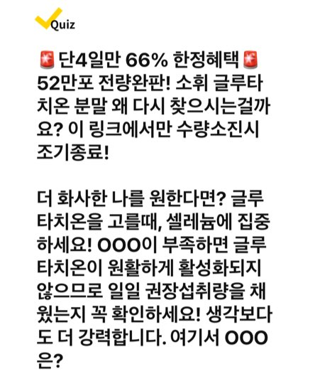 📝 🚨단 4일만 66% 한정혜택🚨52만포 전량 완판! 소휘 글루타치온 분말 왜 다시 찾으시는걸까요? 이 링크에서만 수량 소진시 조기 종료! 더 화사한 나를 원한다면? 글루타치온을 고를때, 셀레늄에 집중하세요! 셀레늄이 부족하면 OOOOO이 원활하게 활성화되지 않으므로 일일 권장섭취량을 채웠는지 꼭 확인하세요! 생각보다도 더 강력합니다. 여기서 OOOOO은?