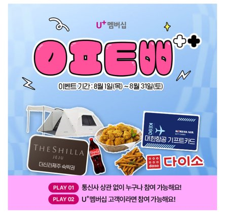 📝 [8월 단독 혜택 놓치지 마세요!] 8월 유플러스 멤버십에서 준비한 역대급 혜택입니다. 이적, 죠지 1+1 라이브 직관 티켓, BBQ 치킨 부터 코베어텐트, 대한항공 기프트카드, 제주 신라호텔 오션뷰까지 드리는 통신사 상관없이 누구든 받을 수 있는 OOOOOO, 빈칸에 들어갈 단어는 무엇일까요? (힌트 : ㅇㅍㅌㅃㅎㅌ)