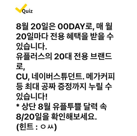 📝 8월 20일은 OODAY로, 매 월 20일마다 전용 혜택을 받을 수 있습니다. 유플러스의 20대 전용 브랜드로, CU, 네이버스튜던트, 메가커피 등 최대 공짜 증정까지 누릴 수 있습니다! *상단 8월 유플투쁠 달력 속 8/20일을 확인해보세요! (힌트 : ㅇㅆ)