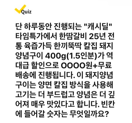 📝 단 하루동안 진행되는 "캐시딜" 타임특가에서 한땀갈비 25년 전통 육즙가득 한끼뚝딱 칼집 돼지 양념구이 400g(1.5인분)가 역대급 할인으로 OOOO원+무료배송에 진행됩니다. 이 돼지양념구이는 양면 칼집 방식을 사용해 고기는 더 부드럽고 양념은 더 깊어져 매우 맛있다고 합니다. 빈칸에 들어갈 숫자는 무엇일까요?