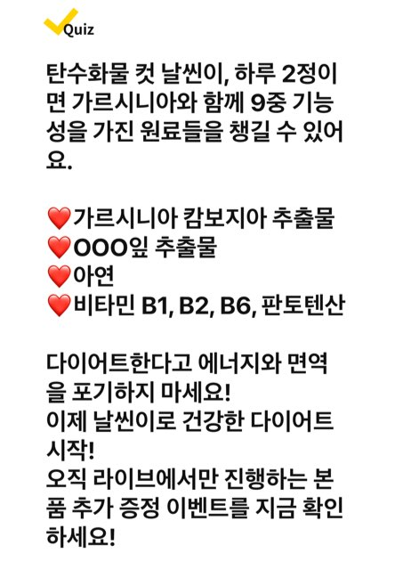📝 탄수화물 컷 날씬이, 하루 2정이면 가르시니아와 함게 9중 기능성을 가진 원료들을 챙길 수 있어요 ❤️가르시니아 캄보지아 추출물 ❤️OOO잎 추출물 ❤️아연 ❤️비타민 B1, B2, B6, 판토텐산 다이어트한다고 에너지와 면역을 포기하지마세요! 이제 날씬이로 건강한 다이어트 시작! 오직 라이브에서만 진행하는 본품 추가 증정 이벤트를 지급 확인하세요!