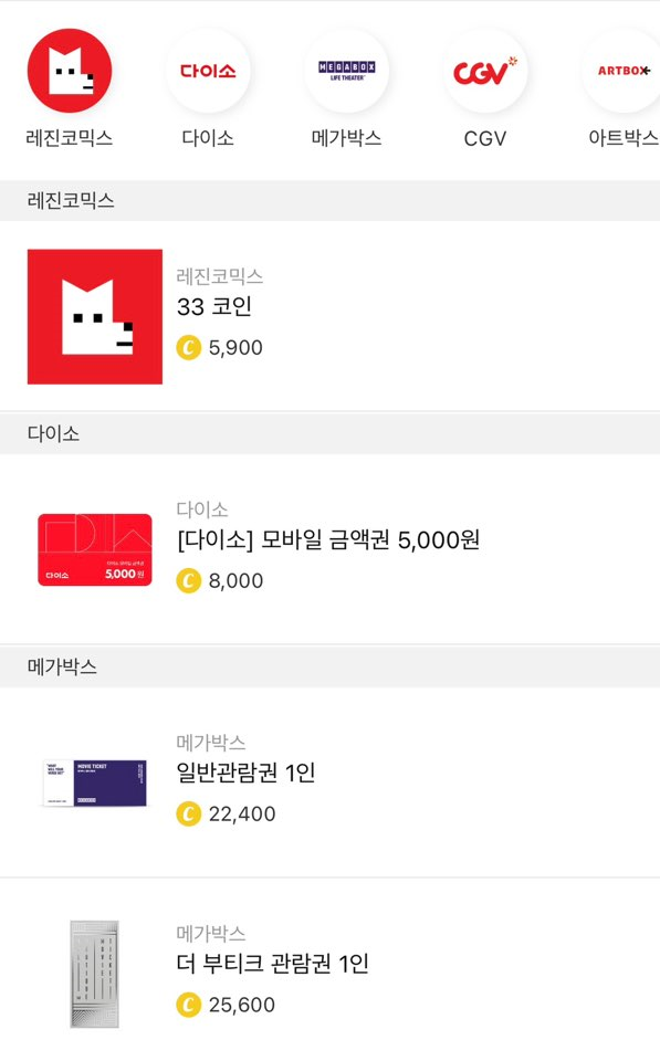 캐시워크에서 알뜰히 모은 포인트는 기프티콘으로 교환하거나, 캐시워크 내에서 뽑기 등의 프로그램에서 사용할 수 있습니다! 저는 기프티콘으로 교환하기 위해 차곡차곡 포인트를 모아가는 중이에요 😊✌️✌️ 커피/베이커리, 떡볶이 치킨 등 외식, 편의점상품들, 각종 생활용품 등! 다양한 기프티콘으로 교환이 가능합니다.