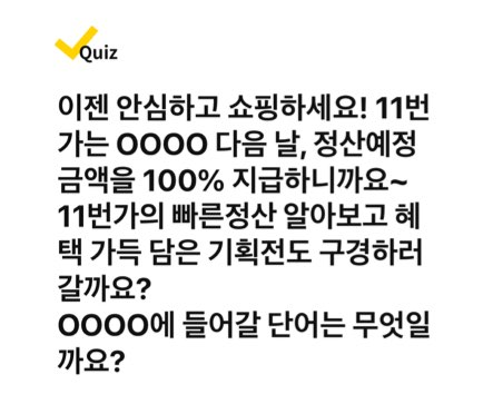 📝 이제 안심하고 쇼핑하세요! 11번가는 OOOO 다음 날, 정산예정 금액을 100% 지급하니까요~ 11번가의 빠른정산 알아보고 혜택 가득 담은 기획전도 구경하러 갈까요? OOOO에 들어갈 단어는 무엇일까요?