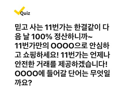 📝 불안한 쇼핑은 이제 그만! 11번가에서 안심하고 쇼핑하세요~ 빠른정산, 빠른배송! 11번가는 한결같이 OOO 100% 정산합니다! OOO에 들어갈 단어는 무엇일까요?