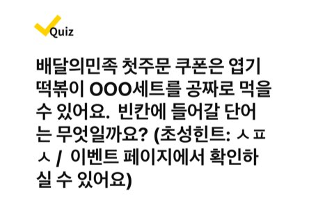 📝 배달의민족 첫주문 쿠폰은 엽기떡복이 OOO세트를 공짜로 먹을 수 있어요. 빈칸에 들어갈 단어는 무엇일까요? (초성힌트 : ㅅㅍㅅ / 이벤트 페이지에서 확인하실 수 있어요)