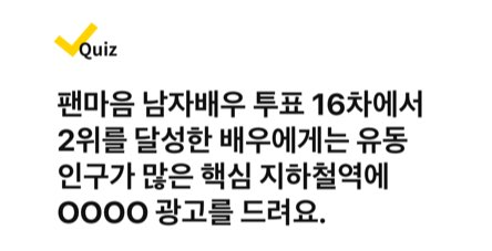 📝 팬마음 남자배우 투표 16차에서 2위를 달성한 배우에게는 유동 인구가 많은 핵심 지하철역에 OOOO 광고를 드려요.