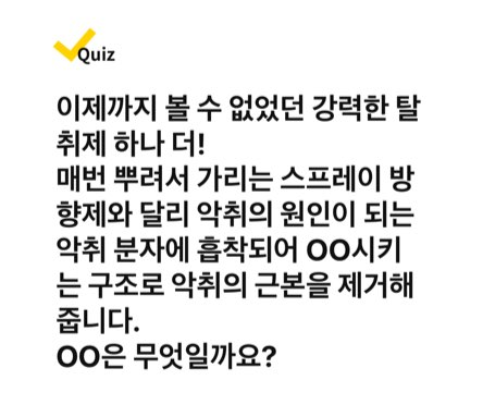 📝 이제까지 볼 수 없었던 강력한 탈취제 하나 더! 매번 뿌려서 가리는 스프레이 방향제와 달리 악취의 원인이 되는 악취 분자에 흡착되어 OO시키는 구조로 악취의 근본을 제거해줍니다. OO은 무엇일까요?