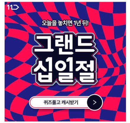 📝 11월 11일! 1년을 기다린 그랜드십일절 OOO에서 딱 오늘 하루 최대 88% OOO 득템 찬스가 끝나니까, 놓치면 1년을 후회해요! OOO에 들어갈 단어는 무엇일까요?