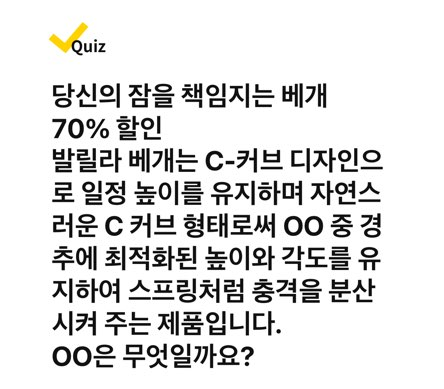 📝 당신의 잠을 책임지는 베개 70% 할인 발릴라 베개는 C-커브 디자인으로 일정 높이를 유지하며 자연스러운 C커브 형태로서 OO 중 경추에 최적화된 높이와 각도를 유지하여 스프링처럼 충격을 분산 시켜주는 제품입니다. OO은 무엇일까요?